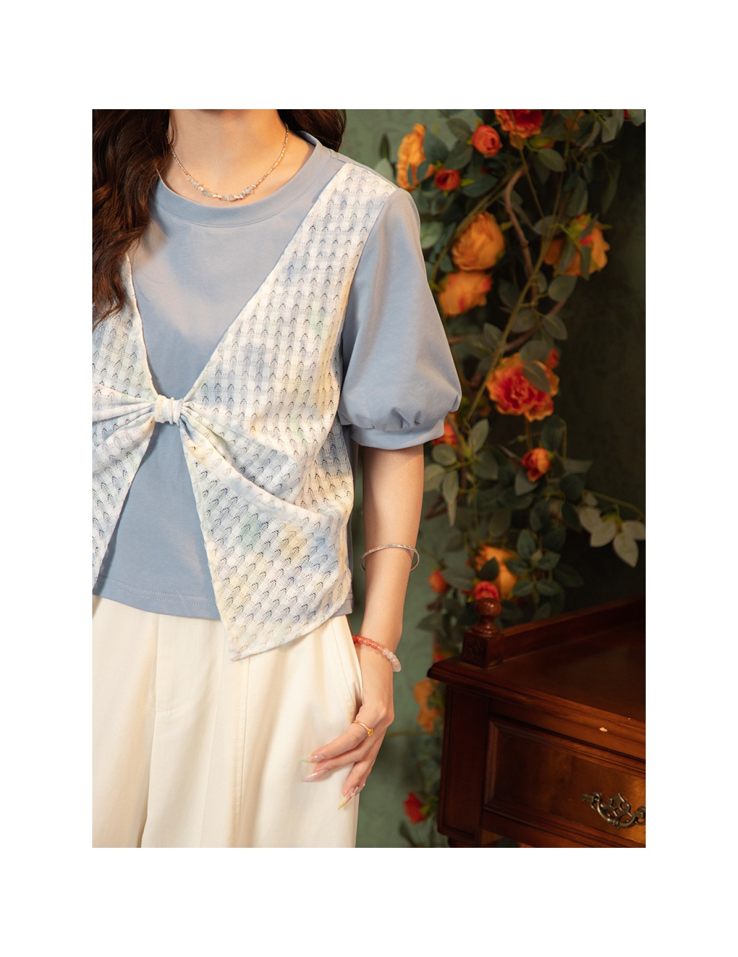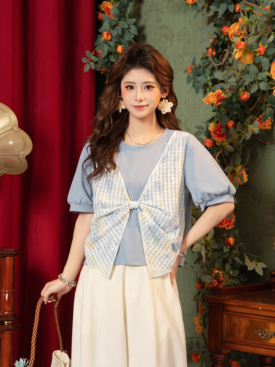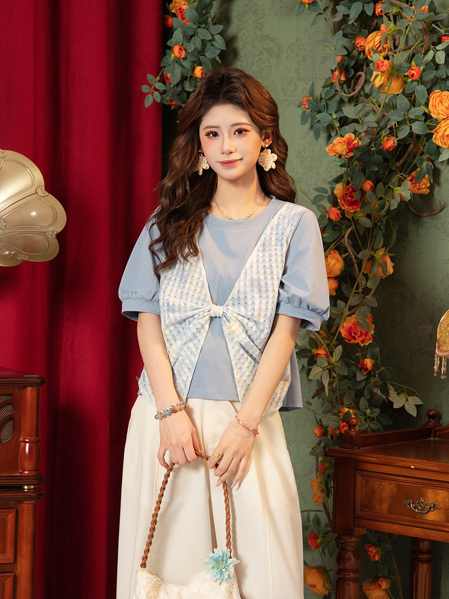 FCTP6416A100010 假兩件蝴蝶結上衣女夏季設計感短袖T恤