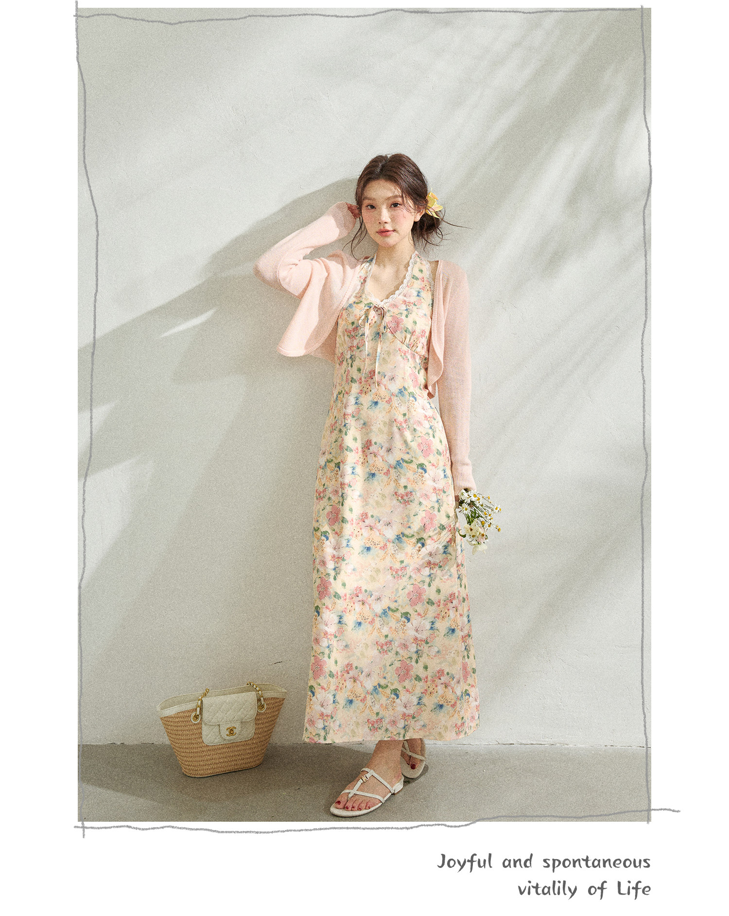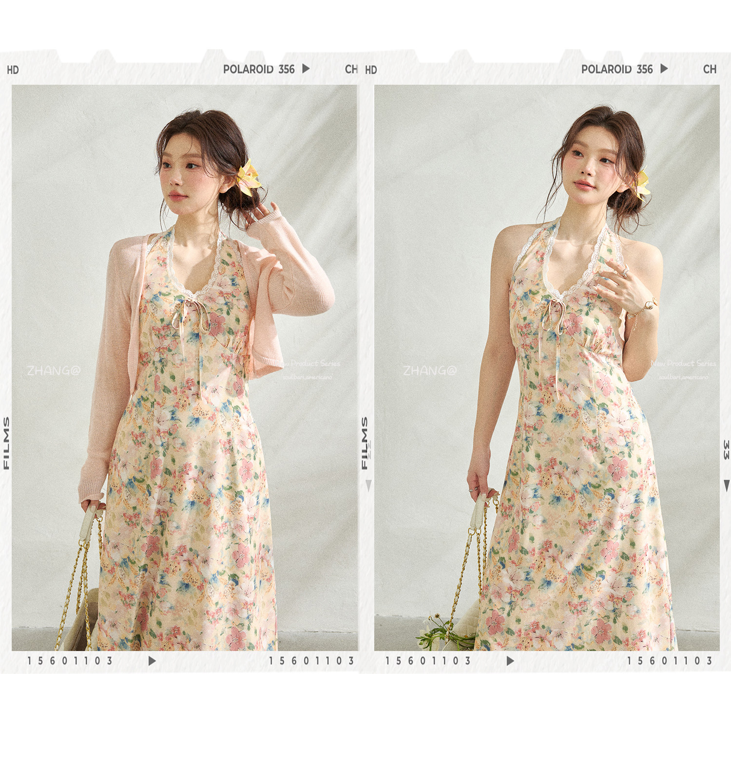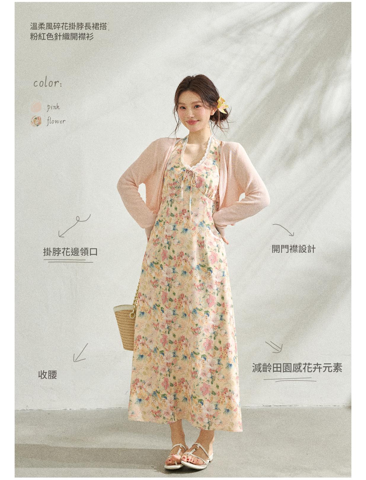 FCCB6421004 瘦浪漫度假掛脖v領碎花度假連身裙套裝