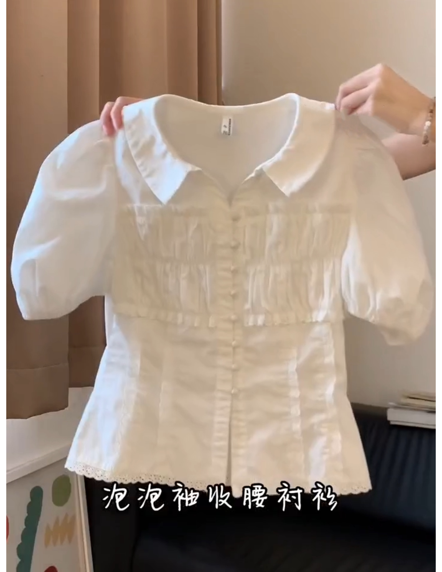 FCSE6424003 2026春款韓系學院風白色泡泡袖襯衫休閒褲兩件式女百搭顯瘦套裝
