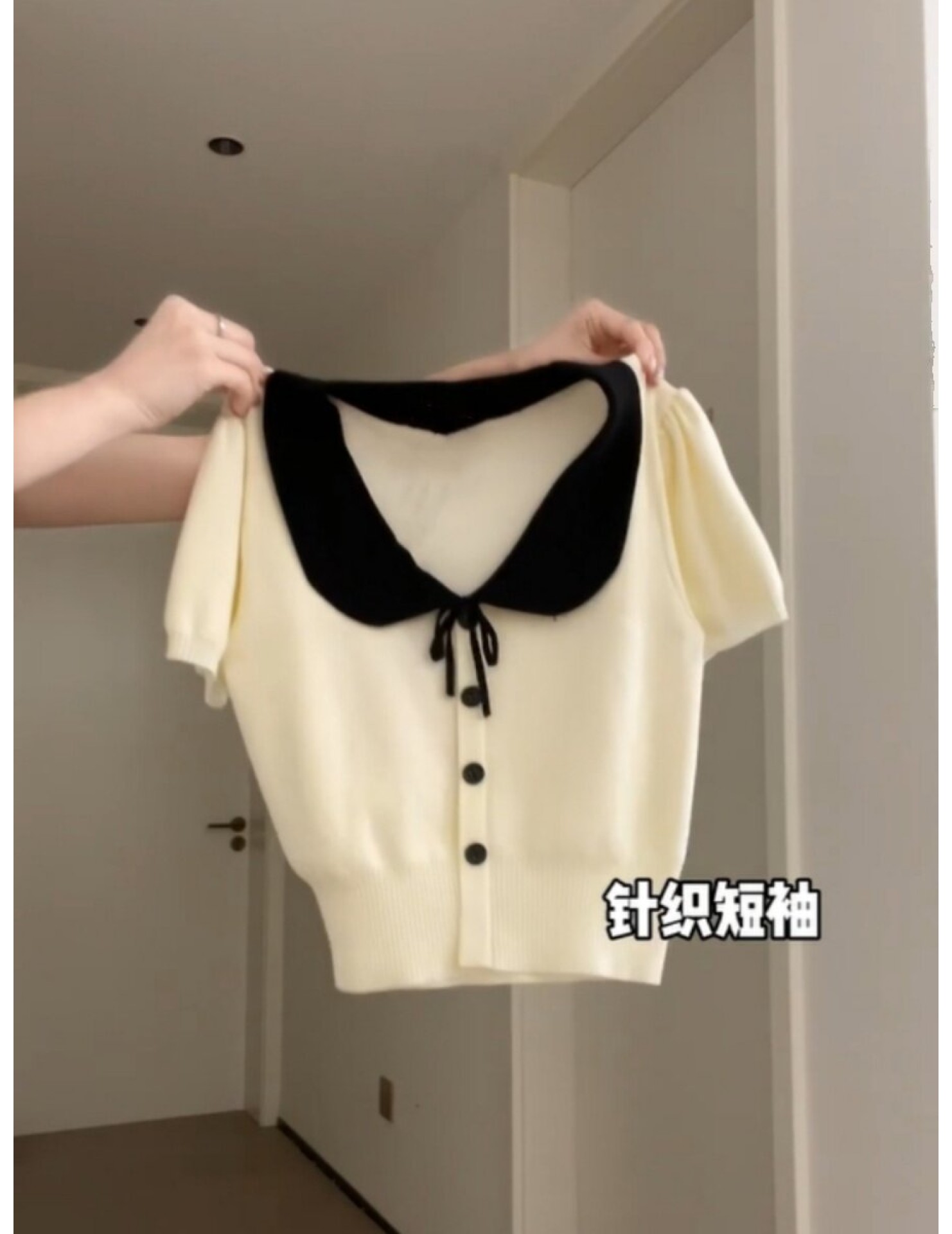 FCSE6424005 薄款短袖冰絲針織衫女夏季2024修身顯瘦娃娃領短版上衣韓版修身潮